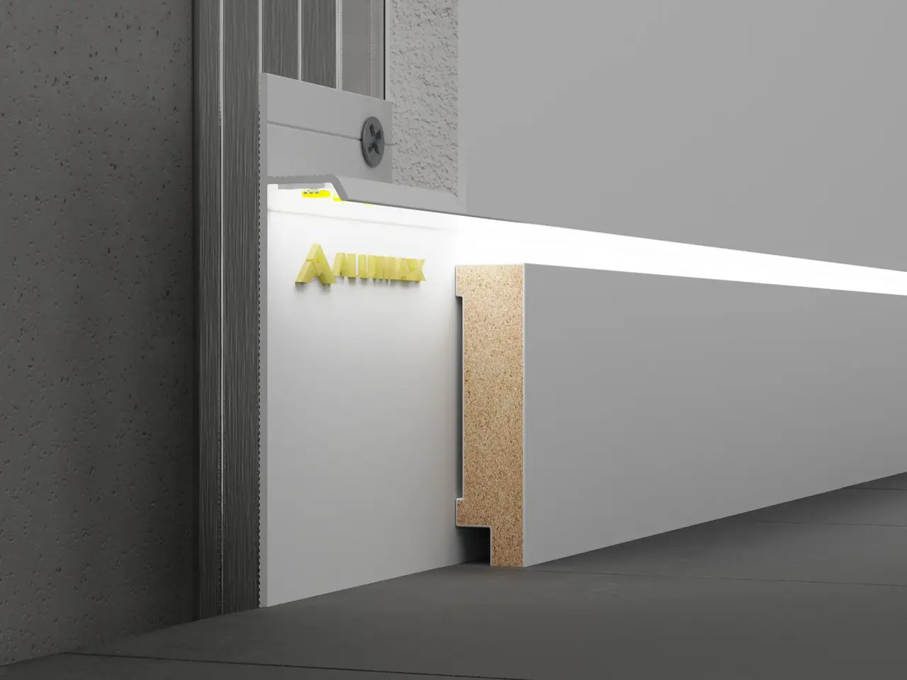 Прихований алюмінієвий плінтус заввишки 60 мм придасть оригінальності будь-якому інтер’єру, є незамінним при використанні дверей прихованого монтажу. Виготовлюється планкою довжиною 2600 мм.