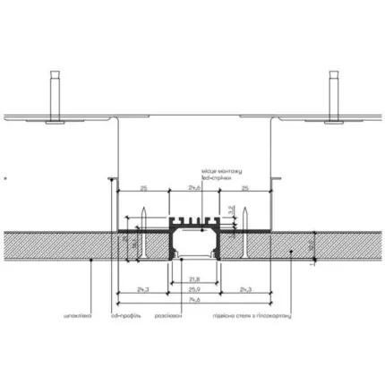 Врізний профіль для гіпсокартону з LED каналом 53×13,2×14